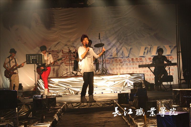 “向前追,不后退,前方一定会很美,不后退,用力追,就算痛苦就算累……”,简单的歌词,朗朗上口的旋律,一如这场歌友会的绝对男主角—芦岩,耿直、执着、简单却又倔强不服输。3月31日晚,在原创歌曲《飞》营造的轻摇滚的氛围中,我校校园歌手芦岩的首场歌友会在艺术楼六楼揭开了神秘的面纱。武汉第一乐队伴奏、重新搭建的舞台,炫美的灯光,充满创意的舞美效果,以及各个角落的蓝银两色在一路捕捉每个瞬间的追光的映照折射下,一次又一次的向现场观众展示出歌友会的主题—I can fiy,也述说着芦岩举办这场歌友会的初衷—结束自己一个阶段的梦想,以崭新的姿态迈向人生的另一个阶段,希望有梦的人也能够勇敢的飞。